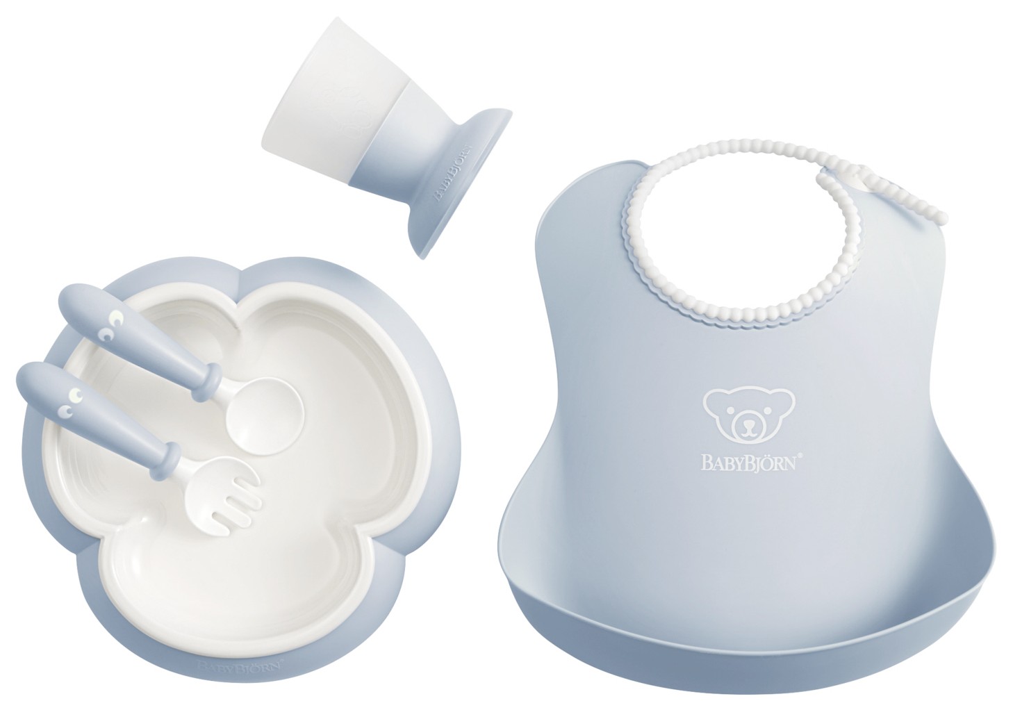 Babybjorn Dětský jídelní set je 5dílná sada v minimalistickém provedení. Talířek má zaoblené a zkosené boky i protiskluzovou spodní stranu, díky které pevně drží na stole, jeho tvar trojlístku zase umožňuje lehce nabrat jídlo na lžičku. Hrneček je stabilní pro snadné učení samostatného pití, lžička i vidlička padnou do dětské ručky a bryndák s korýtkem zachytí zbytky jídla.
