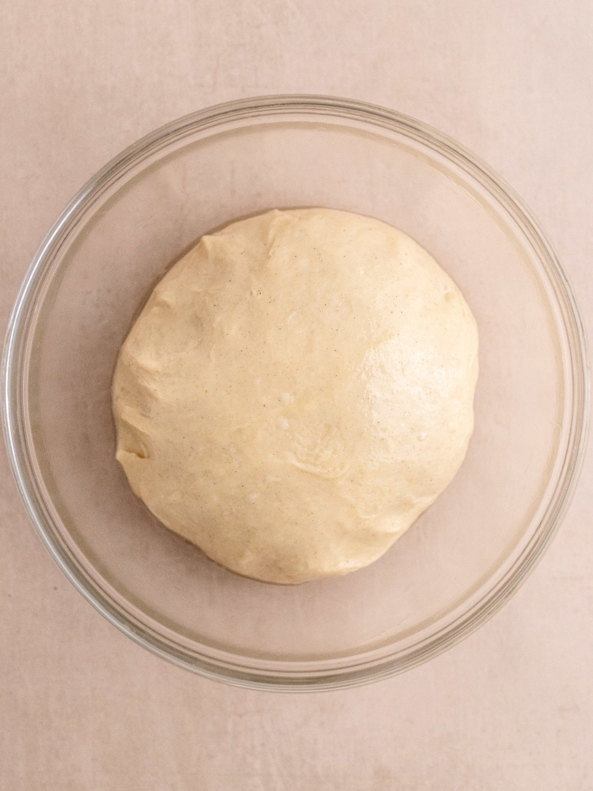 1. V míse stojanového mixéru vybaveného hákem na těsto smíchejte mléko, droždí a hnědý cukr. Necháme 5-10 minut uležet, dokud navrchu nevzniknou bublinky. Přidejte máslo, vejce, sůl a začínáme přidávat postupně mouku a zapracovávat. Nejprve zhruba polovinu a přidáváme dokud těsto přestane lepit a není řídké. Pomocí háku na těsto míchejte, dokud se mouka zcela nezapracuje, asi 4–5 minut. Pokud se těsto stále lepí, přidejte další trochu mouky.