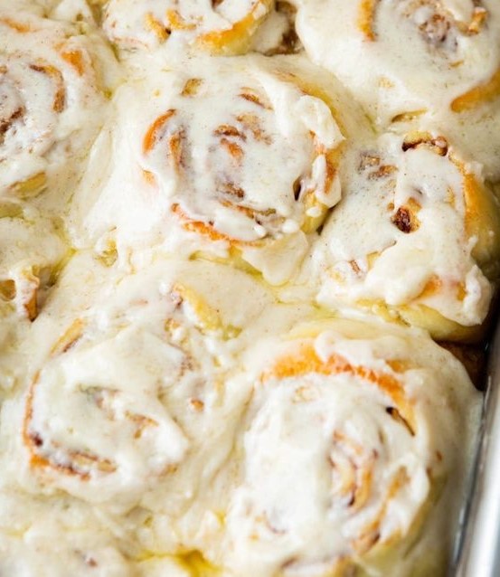 7. Mezitím si udělejte polevu. Rozpuštěné máslo přidejte do mísy se smetanovým sýrem zašlehejte s cukrem, javorovým sirupem, vanilkou a špetkou soli. Rolky potřete polevou dokud jsou ještě teplé, poleva se do nich vsákne a jsou naprosto božské!