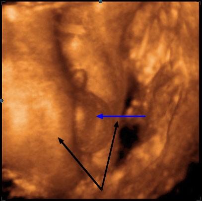 Detail zadečku miminka ve 30. týdnu těhotenství. Plod je mužského pohlaví. Mezi stehny plodu (černé šipky) je zřetelný penis, pod ním šourek (modrá šipka).