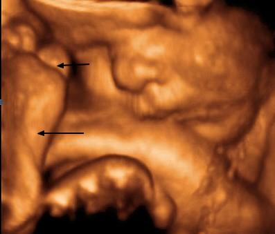 Snímek jasně demonstruje, že v prostoru vymezeném plodovými obaly začíná být plodu poněkud těsno. V blízkosti obličeje jsou zachyceny jak horní, tak dolní končetina. Na chodidle nožičky (dolní šipka) je dobře patrný mohutnější paleček (horní šipka) a štíhlejší prsty.
