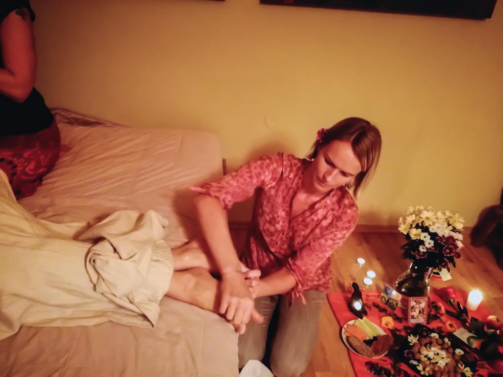 Po těch silných i veselých okamžicích jsme se vrhly na plný stůl dobrot. Ale tím to neskončilo. Po občerstvení mě uložily na postel, kde o mě tři z nich pečovaly. Lucka pracovala na mých čakrách pomocí reiki, Blanka mě hladila a kdo ví, co krásného mi nakvantila a Peťka mi masírovala nohy! Užívala jsem si to a byla v sedmém nebi. Mariánek celou dobu klidně spal. I já jsem byla úžasně relaxovaná.