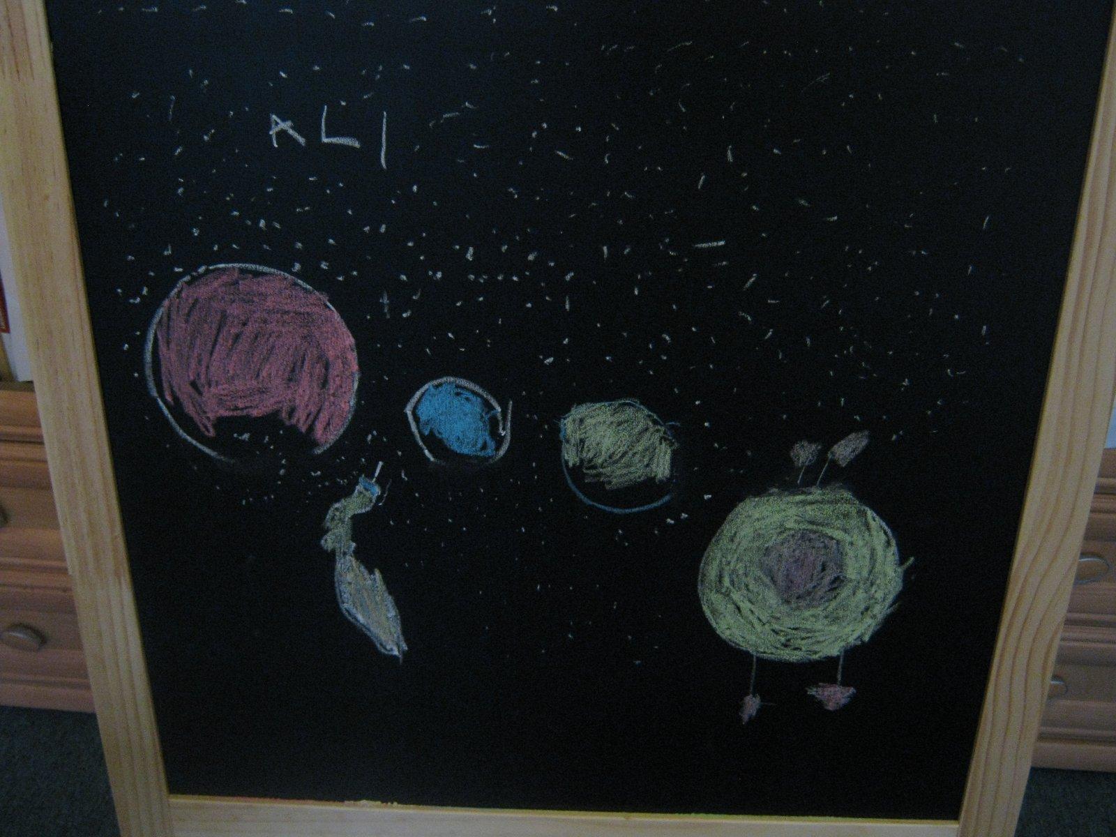 Alikův dnešní vesmír :-) ty umazané kousky planet - to už je tma - prej :-D a to otykadlované vpravo je ufo prosím :-) to pod planetkama vlevo je raketa :-D a to množství teček jsou hvězdy :-)