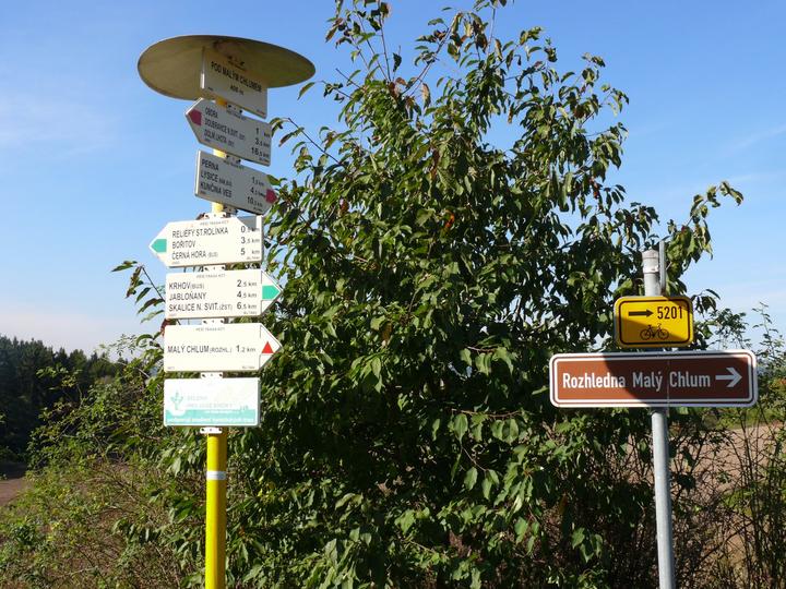 Kousek dále nad Pískovnou, zhruba 300m je po levé straně malá vyhlídka s lavičkou a popisnými cedulemi, kde můžete sednout a relaxovat, pohled je na Velký Chlum.