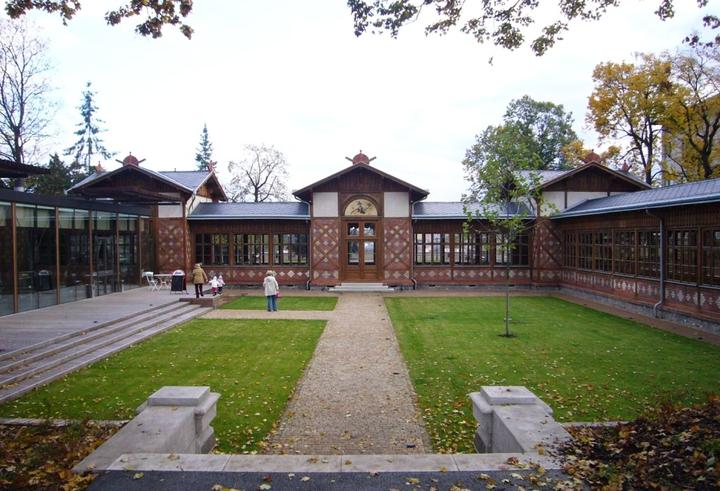 Pavilon nacházející se v horní části parku byl vybudován v 70. letech 19. století podle návrhu Josefa Schulze. Původně sloužil jako zahradní herna se střelnicí, kuželnou, šachovými stoly a dalšími atrakcemi, kde si mohli návštěvníci tehdejšího areálu odpočinout a odreagovat se. Pavilon později během 20. století sloužil jako jesle nebo hospoda. V roce 1989 ho převzala společně s celým areálem do vlastnictví městská část Praha 2, která zjistila, že pavilón se nachází v havarijním stavu. Při prvních restaurátorských pracích bylo zjištěno, že se v interiérech pavilónu nacházejí vzácné nástěnné historické malby, které byly ukryty pod izolací z dob, kdy budova sloužila jako jesle.