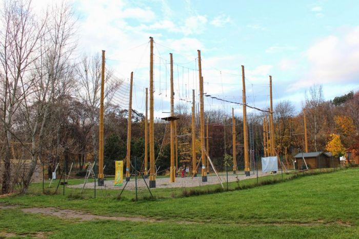 Dominantu představuje hrací prvek ve tvaru věže, která ve zmenšeném měřítku kopíruje nedalekou věž vodárenskou. Věž je spojená se skluzavkou sítěmi, šplhadly a lanovkou. Kromě toho najdeme v komplexu více než deset dalších prvků: houpačku „hnízdo“, houpadla atd. Většina z nich (včetně stojanů na kola) je samozřejmě vyrobena ze dřeva. Povrch hřiště pokrývá litá guma. Areál obklopují vzrostlé stromy, ale většina atrakcí stojí mimo stín. V samostatné části se nachází velká trampolína ve tvaru obloukové střechy a hřiště na basketbal nebo malý fotbal. Na hřišti stojí domek správce a toalety. U správce si můžete vypůjčit míče. Před vstupem lze využít úvaziště pro psy. Vzhledem k tomu, že hřiště je součástí sportovního komplexu, je jeho návštěva vhodná i pro rodiny se staršími dětmi.