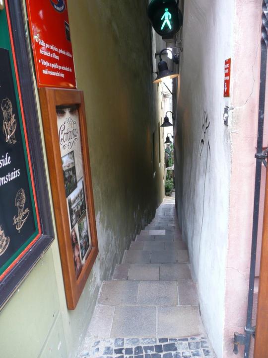 Těsná ulička ve středověku sloužila jako přístupový koridor k vltavskému rameni. V minulosti se podobných průchodů nacházelo v hlavním městě velké množství a jejich rozměr odpovídal tehdejší civilní architektonické filosofii - „čím menší, tím lepší“.