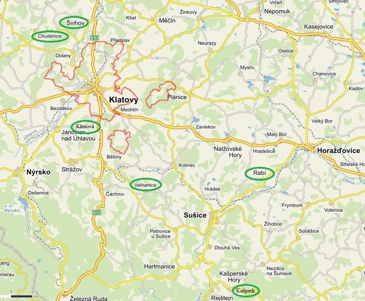 Přibližně třináct kilometrů na jihozápad od Klatov se na vrchu zdvihajícím se nad širokým údolím Úhlavy nachází zřícenina hradu Klenová. Spolu s přilehlým zámkem z 19. století a celým komplexem staveb v podhradí, které náležely k panskému sídlu (sýpka, statek, kaple sv. Felixe, vila), je dnes spravován Galerií Klatovy / Klenová.
