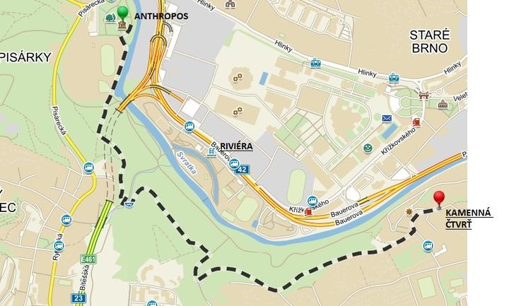 Dnes se v našem putování po Brně budeme pohybovat okolo řeky Svratky, pozvu vás na procházku, kde najdete spoustu zajímavých míst i pro vaše děti. Naše putování začneme v Pavilonu Anthropos, muzeu dějin osídlení, pokračovat budeme po cyklostezce, ze které si můžete odskočit na koupaliště Riviéra, dopravní hřiště či do lanového parku. Na konci se octneme v Kamenné kolonii. Po sestoupení z Kamenky, můžete ještě navštívit zábavní vědecký park VIDA nebo Letohrádek Mistrovských.