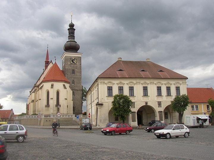 Kostel sv. Kateřiny ze 14. století je gotický, jednolodní s jednou věží. Byl upraven roku 1478 mistrem Linhartem, znovu po požáru 1580 a koncem 17. století P. I. Bayerem. Roku 1929 skončila důkladná oprava a regotizace. Uvnitř má síťovou klenbu a renesanční kruchtu s emporou na sloupových arkádách. Vnitřní zařízení je barokní, v kostele je pozdně gotická Madona (kolem 1510). Severně od kostela (naproti věži) je jednoduchá nízká zvonice. Na severní stěně kostela je mramorová náhrobní deska z roku 1588 a socha sv. Josefa od E. A. Střebského z roku 1745.[4]