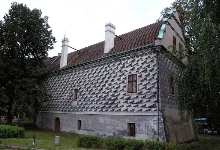 Jednopatrovou, nepodsklepenou budovu o tvaru kosodélníku 23 x 10 metrů si nechal postavit italskými staviteli. Byla opatřena otevřenou lodžií, vyzdobena sgrafity. Stěny byly opatřeny dvojitou omítkou. Na spodní bílé byla nanesena druhá s rozemletým dřevěným uhlím, ta byla štukatéry seškrabána do tvaru černobílých psaníček Okna a dveře byly natřeny do červena, navíc zde byla později i barvírna, proto se takto po čase nazýval i celý dům. Dlouho sloužil panstvu jako lovecký zámeček.