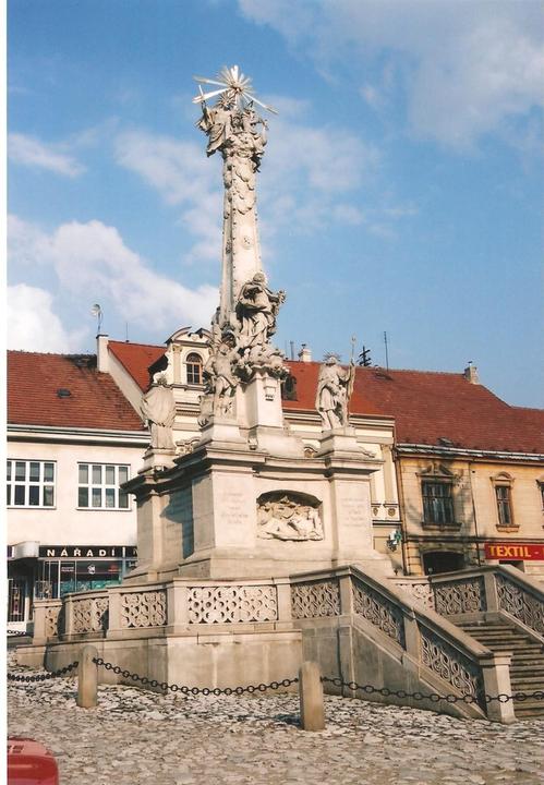 Dalším je Morový sloup. 14 m vysoká dominanta horního konce hlavního náměstí pochází z r. 1736. Po opakovaných morových epidemiích, kterým podlehly stovky obyvatel, byly ve městě postaveny dvě stavby: kaple a původně jednoduchý sloup. Ten je zasvěcen tzv. morovým patronům (sv. Rochu, Šebestiánu, Františku Xaverskému a Karlu Boromejskému). V úpatí sloupu jsou sochy Panny Marie a sv. Josefa. Ležící postavy v náznaku jeskyně patří sv. Rozálii a Alžbětě. Vrcholu vévodí sv. Trojice se svatozáří. V nedávné době byl sloup kompletně restaurován.