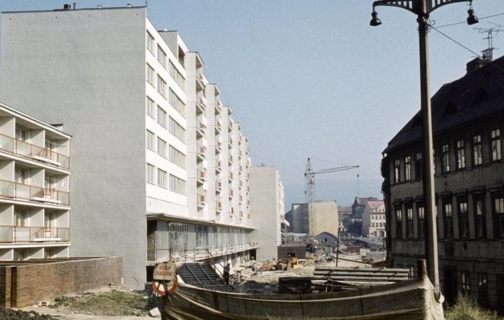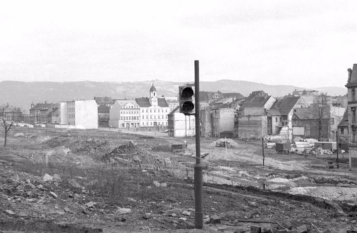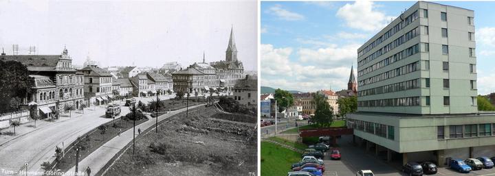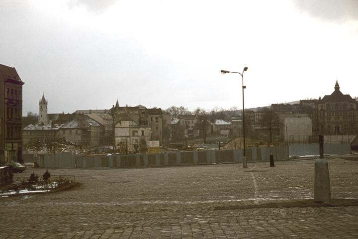 Druhý obrázek (1976) zachycuje náměstí už bez všech těch budov. Třetí obrázek ukazuje náměstí z jiného úhlu, každopádně zde vidíme zbouranou dolní část náměstí, a na čtvrtém obrázku za co byly staré krásné budovy vyměněny.