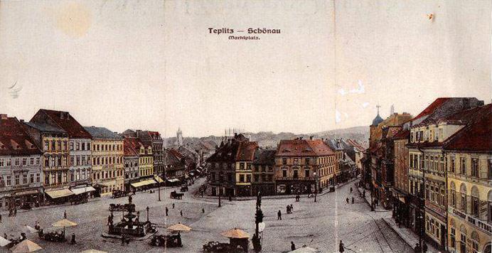 Teplické bolesti I: "sanace centra". Začnu zde socialistickou proměnou nejdůležitějšího náměstí ve městě, dnešního náměstí Svobody. Na prvním obrázku je tehdejší Marktplatz kolem roku 1915. Všechny domy bloku ve spodní části náměstí, obě dolní ulice ústící na náměstí i všechny domy po pravé straně náměstí budou v 70. letech 20. století zbourány a nahrazeny nevzhlednými železobetonovými budovami.