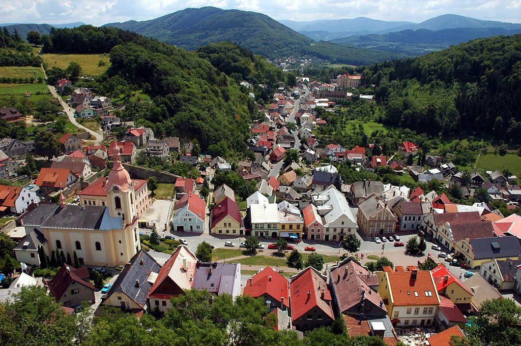 Pohled na náměstí ve Štramberku, které se jmenuje prostě Náměstí. Vzadu pak zbytek města Štramberk