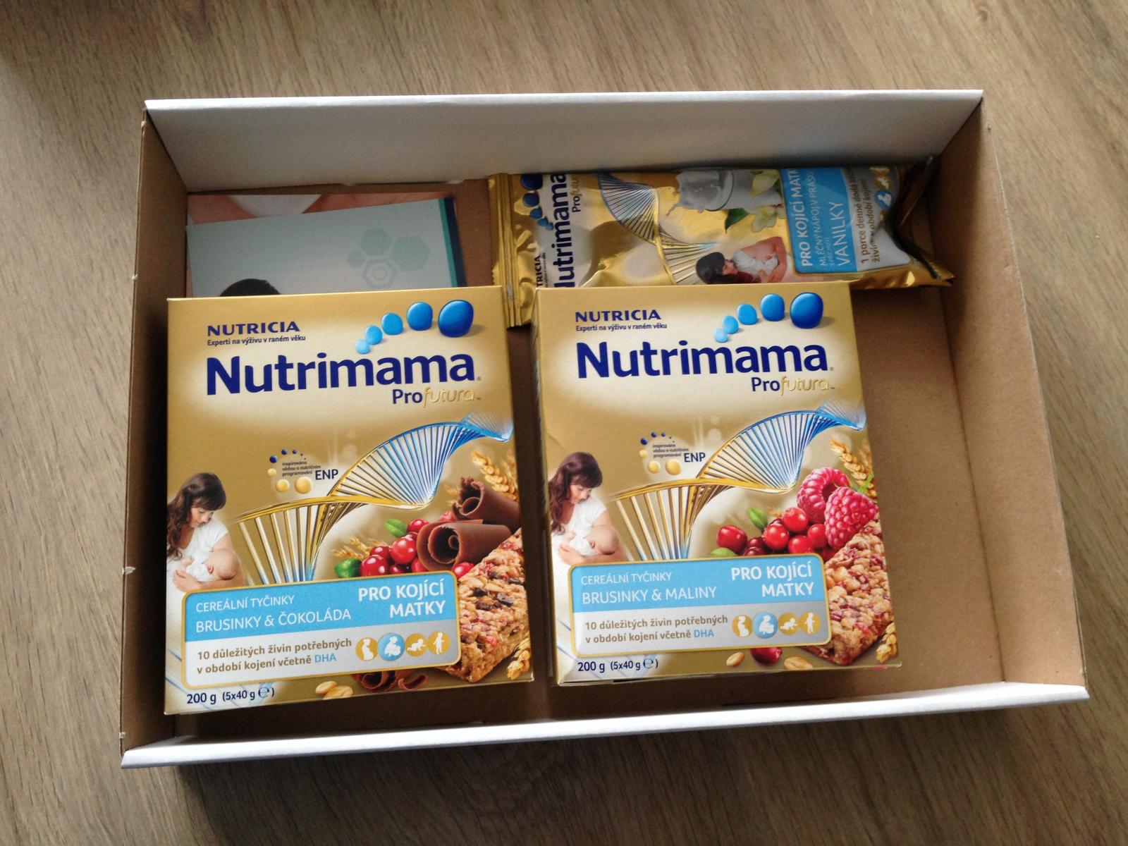 Balíček obsahoval dvě balení Nutrimama Profutura cereálních tyčinek -- jeden byl s tyčinkami s brusinkami a malinami a druhý s čokoládou. Oba splňují nároky mé přísné diety (obsahují sojový lecitin, ale ten synovi nevadí).