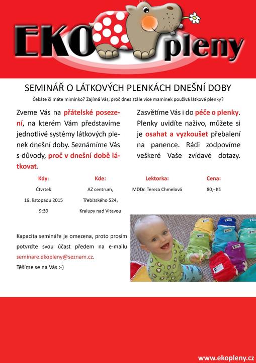 Milé maminky, chystáme pro Vás další SEMINÁŘE o látkových plenkách dnešní doby - čtvrtek 1.10. PRAHA 6, pátek 2.10. PLZEŇ, pátek 9.10. MLADÁ BOLESLAV, PRAHA VÍKENDOVÝ TERMÍN neděle 11.10. 14.00, čtvrtek 15.10. ČESKÁ LÍPA, středa 21.10. DĚČÍN, pátek 23.10. MĚLNÍK a čtvrtek 19.11. KRALUPY NAD VLTAVOU. Bližší informace ráda poskytnu, prosíme o rezervaci na mail seminare.ekopleny@seznam.cz