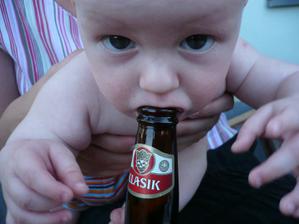 Mlíka je dost, jen malý pecivál nechce pít. Takže nasává z flaštičky odstříkané mlíčko.