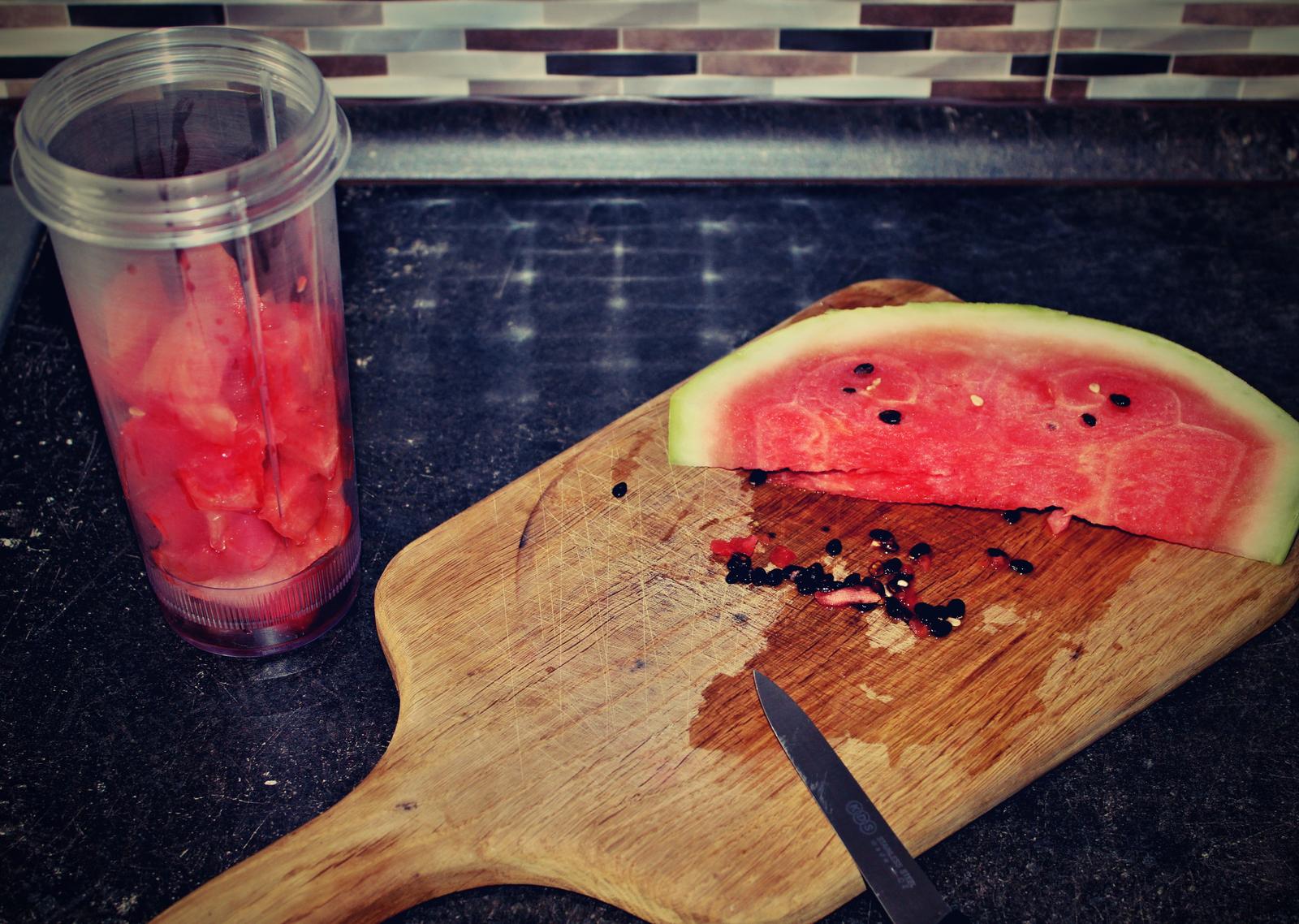 1. Nejprve je potřeba vypeckovat meloun (samozřejmě si můžete zakoupit rovnou bezpeckovou variantu, ale ta často není k dostání a mimo to je také výrazně dražší). Meloun nakrájejte na kostky a ty zbavte semínek. Nakrájený a vypeckovaný meloun vložte s trochou vody do mixéru.