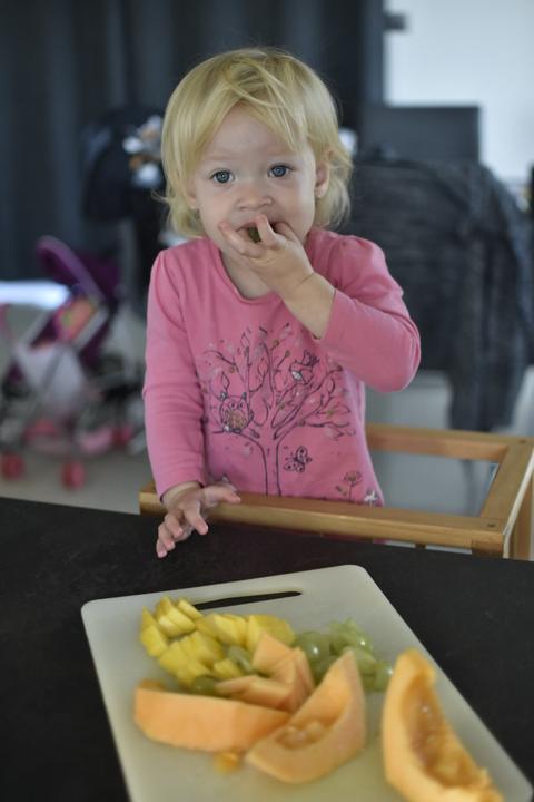 Včerejší barevná snídaně. Čím víc barev tím víc je z toho dcera vedle. Borůvkovy jogurt Billa bio to zvládl na jedničku a dokonce i chutnal. Recept na lívance .