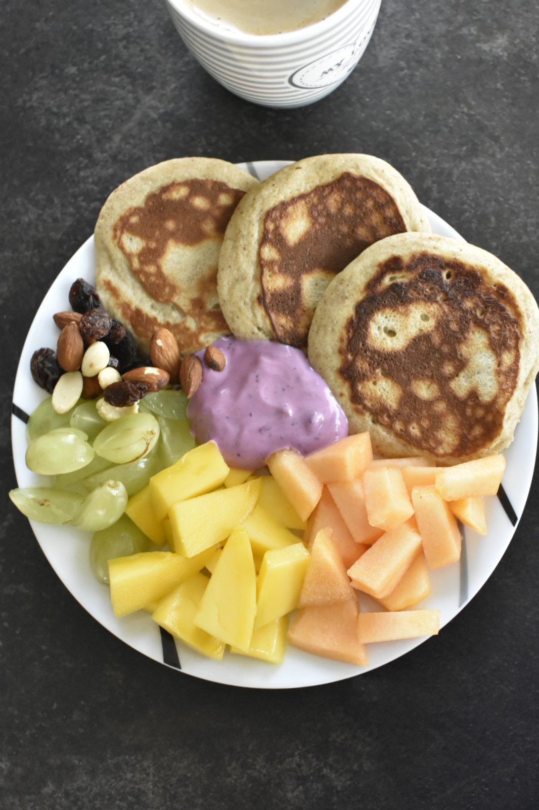 Včerejší barevná snídaně. Čím víc barev tím víc je z toho dcera vedle. Borůvkovy jogurt Billa bio to zvládl na jedničku a dokonce i chutnal. Recept na lívance .