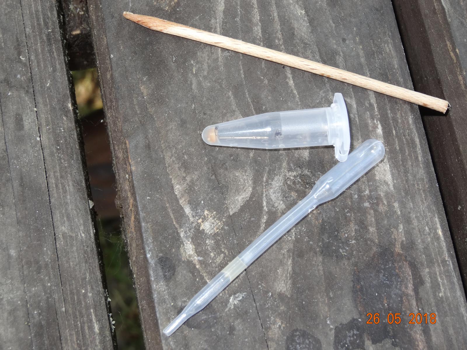 Umístěte klíště do zkumavky a přidejte 3 kapky roztoku. Rozdrťte klíště tak, aby se tekutina stala bezbarvou, použijte k tomu ostrou i plochou stranu dřevěné tyčinky. Nakonec nakapejte roztok do testovacího políčka testovací sady. Uchovávejte mimo dosah dětí!