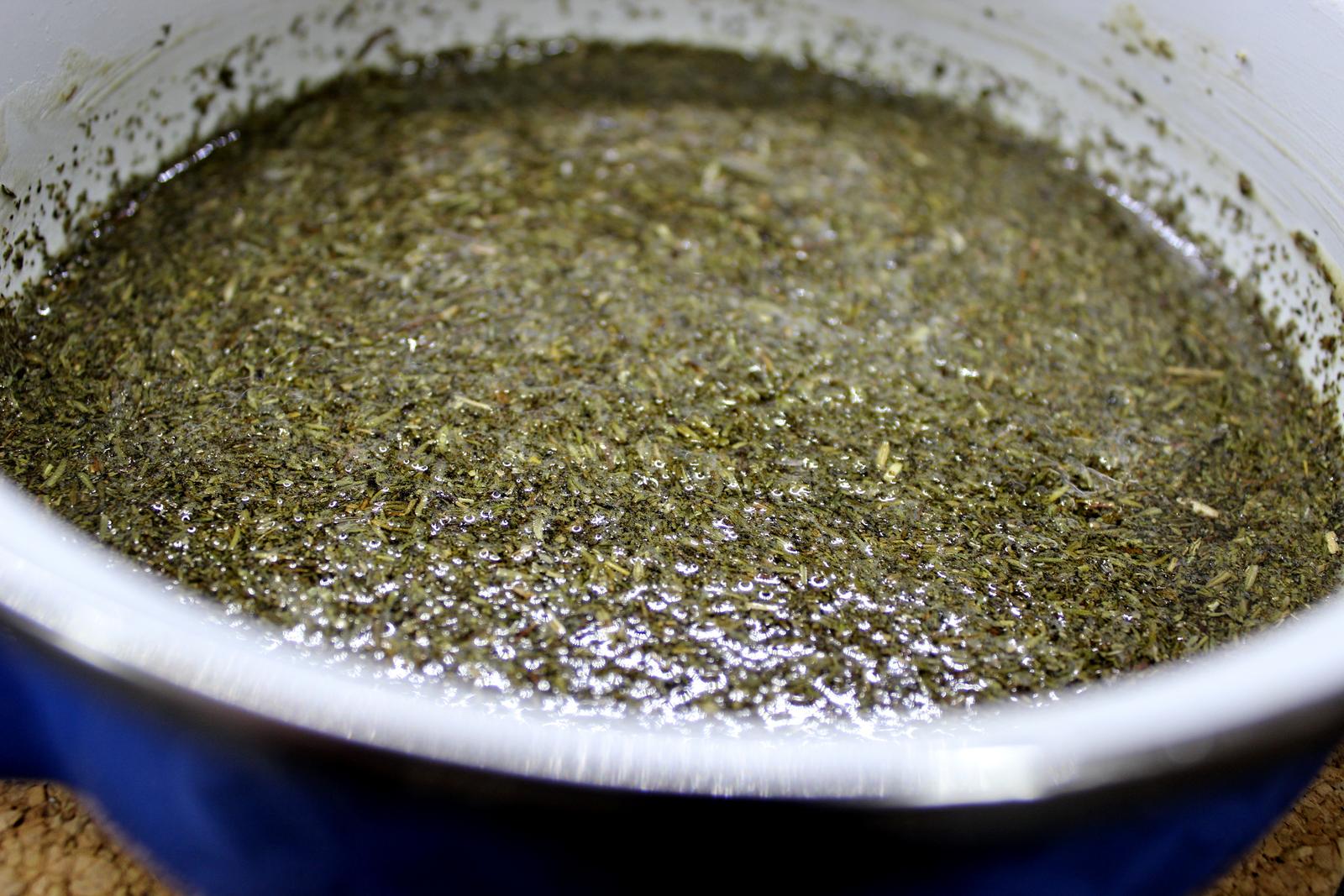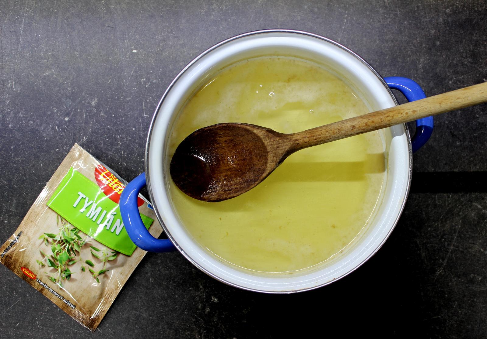 2. Hrnec odstavíme a do ještě teplé směsi přidáme tymián. Pořádně ho promícháme a dbáme na to, aby byly všechny kousky potopené. Poté přikryjeme pokličkou a necháme cca 12 hodin louhovat. Já vařím vždy večer a s prací pokračuji druhý den ráno.