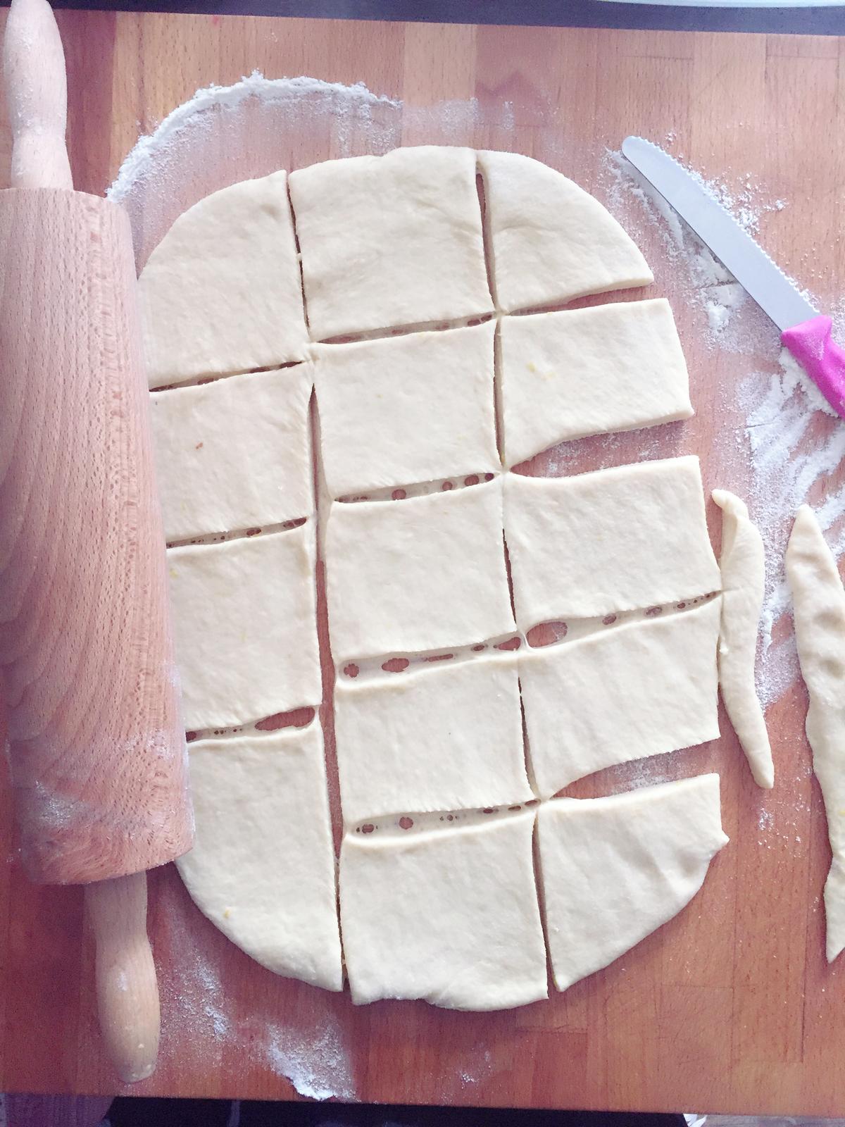 Po dvou hodinách (a jednom prohnání vařečkou) vyklopte těsto na vál a vyválejte na asi centimetr tlustou placku a nožem nebo rádýlkem rozkrájejte na kousky velikosti asi 5x5 cm. Záleží, jak velké buchty máte rádi.