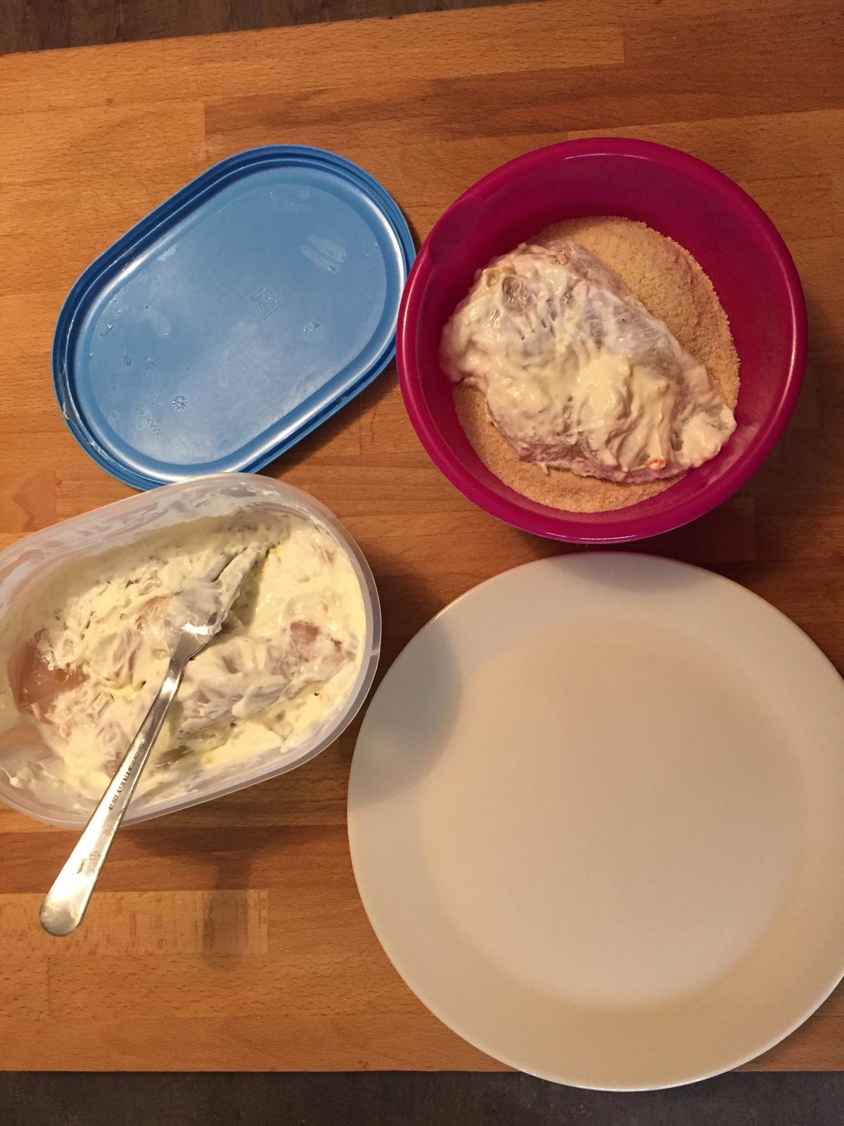 Druhý den vyndejte řízky z marinády, a tak jak jsou je obalujete pečlivě ve strouhance.