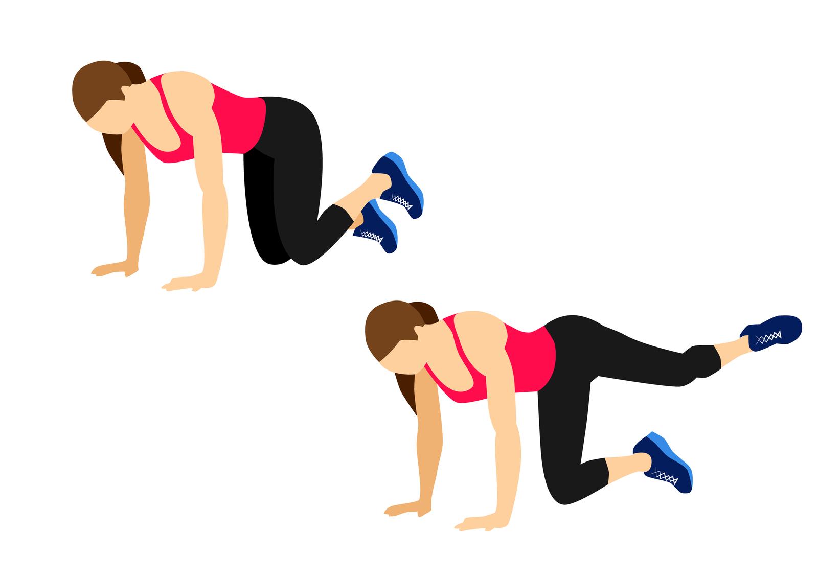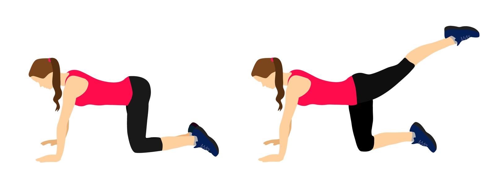 Klekněte si na všechny čtyři (ano, jako osel :D). Dlaně jsou na šířku ramen a kolena na šířku pánve. Zvedněte levou nohu a snažte se patu dostat co nejdále od zadečku. V pozici s nataženou nohou vydržíte zhruba 2 sekundy a poté nohu přitáhněte zpět. Koleno nepokládejte na zem, jen ať maká.