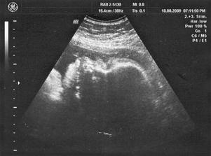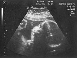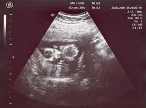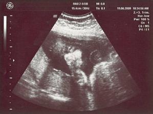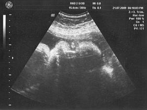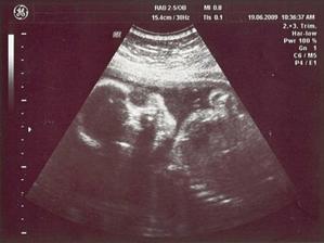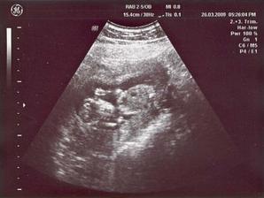 26/3 09 PORADNA 14 + 4 tt - přítel nesmí chybět, žížalka povyrostla, je to mrška neposedná, ani chvíli není v klidu, dr. má problémy vystihnout okamžik aby byla fotka z utz pěkná, nakonec máme fotečky dvě, na jedné jdou vidět oči - vypadá jak marťan 🙂), dr. slíbila že na příští KO už budeme vědět pohlaví ... čekání do 28/4 bude nekonečný
