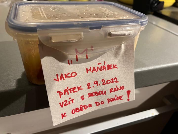 Takový to ze života,aneb dnes mě rozesmál manžel už hned ráno..včera remcal,že mi připravil oběd v lednici do krabičky a nevzala jsem si ho,tak mu říkám,že tam byl jen oběd s listečkem a na něm miniaturní K,což je syn a tím jsem myslela,že je jeho oběd,tak prej to nebylo K,ale M a byl mûj..říkám mu,že vstávám po 3.hod ráno a jsem vůbec ráda,že trefím do lednice a ještě to popíše stroze a nečitelně..tak dnes ráno otevřu lednici a tam toto..no a je to hned jasný,že to je můj dnešní oběd😆👍😊