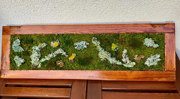 Šla jsem kolem popelnic a tam položenej starej,ošklivej,polorozpadlej dřevěnej rámeček....hned mi ta hlava vymyslela,co s ním..a za hodinu byl hotový mechový obrázek na terasu..