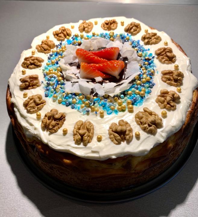 Recept jsem si trochu upravila,ořechy jsem nasekala,k bodu 6 jsem se nedostala 😆,zakončení cheescaku udělala po svém,množství surovin na formu 24cm neodpovídá,ale to každému dojde během přípravy,že je třeba lehce improvizovat😉