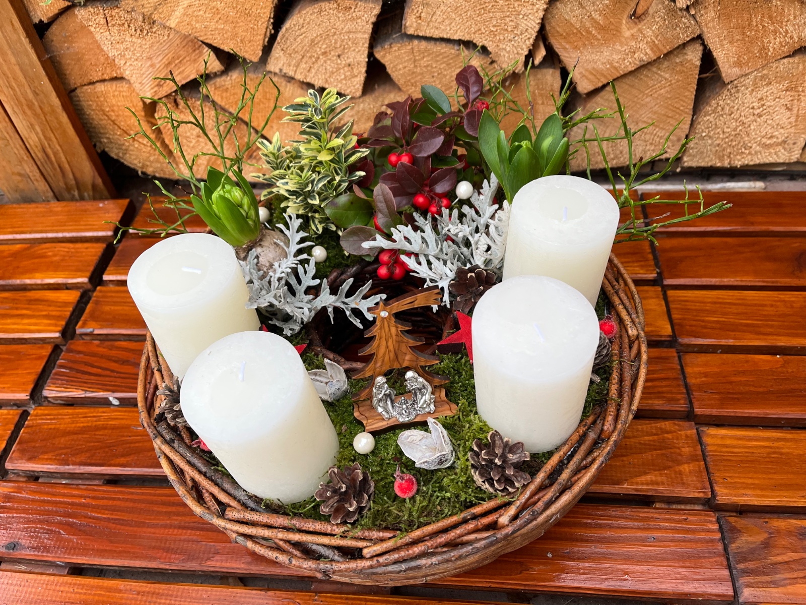 Adventní věnec na poslední chvíli-varianta pro lenivé😉 se zahradou..Když ještě hodinu před setměním nemáte adventní věnec,žádný nápad v hlavě🤦♀️,minimum času,a vlastně se vám vůbec s ničím ani dělat nechce,tak stačí vzít nějakou zimní osázenou misku,co už máte hotovou,mech z trávy v zahradě,píchnout svíčky,pár dekorací a hotovo..