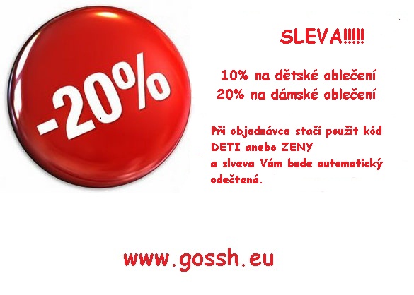 SLEVA v našom eshope www.gossh.eu 10% na veškeré dětské oblečení a 20% na dámské oblečení. Stačí při vyplnění objednávky uvést kód DETI anebo ZENY a cena vám bude automaticky odečtená.