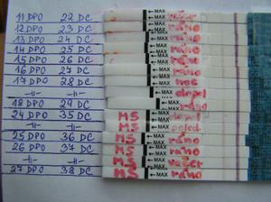 Dávám do albíka na okouknutí dvě fotečky. Na jedné jsou testíky z minulého měsíce, bylo to nadějné, ale pouze pár dní. Tento měsíc se jako zázrakem opět zadařilo, ale jak je vidět čárka nesílí ale slábne, takže bohužel zase nic a čas neúprosně letí. Bohužel musím říct, že Mamatest 10 nestojí za nic. Kontrolní čárky jsou pruhované, test je slaboulinký, dražší o 50% a kromě toho že ukazuje dřív druhou čárku není žádný rozdíl později v barvě čar mezi Mamatestem 10 a 25, jak je vidět z testů ze stejného dne 6.9. Já mám brzy pozitivní testy, protože mívám ovulku tak 10-11 DC a cykly 26 dní. No musím holt čekat dál na to svoje štěstíčko.
