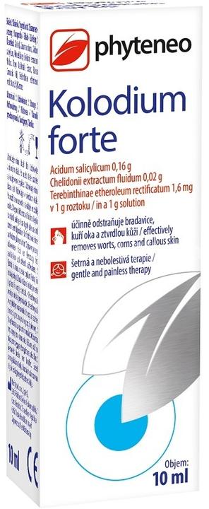 Kolodium forte (roztok k odstraňování bradavic, kuřích ok a zrohovatělé kůže) spadá do kategorie zdravotnických prostředků s obsahem léčivých látek. Jak už jsem psala dříve, v produktech značky Phyteneo jsou používány léčivé látky herbálního původu – tedy z léčivých rostlin. U Kolodia forte jsou použity léčivé látky konkrétně z borovice a vlaštovičníku. Obsahuje sloučeniny čištěné terpentýnové silice z borovicové pryskyřice, které mají mimo jiné účinky antiseptické (dezinfekční, ničící choroboplodné zárodky) a sloučeniny vyskytující se v extraktu z vlaštovičníku většího. Ty mají při zevním použití účinky antimikrobiální (působící proti mikroorganismům – bakteriím a virům) a antimykotické (proti plísním a kvasinkám).