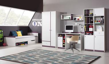 STONE - moderní modulový nábytek do dětského / studentského pokoje dostupný ve dvou moderních barevných provedení borovice / lilek, nebo borovice / zelená. Jednoduchý a moderní styl, variabilnost a velký úložný prostor jsou hlavní předností tohoto dětského nábytku.