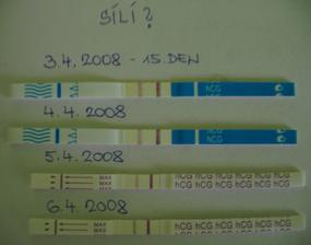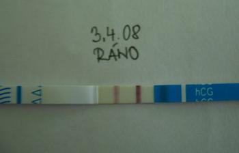 13.4.2008: Ráno těhutestík - testovací čárka je silnější .-). Už ani nešpiním. Jsem o poznání klidnější.