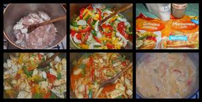 Krutí, červená, žlutá a zelená paprika, cibule, česnek, sůl, pepř, gril. koření, ml. paprika, parmezán, penne, mléko, smetana