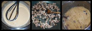 Špagety, sůl, olivový olej, 250g anglická slanina, máslo, 100g sýr (parmazán), 6 vajec, 3lžíce smetany ke šlehání, ml.pepř, muškátový oříšek