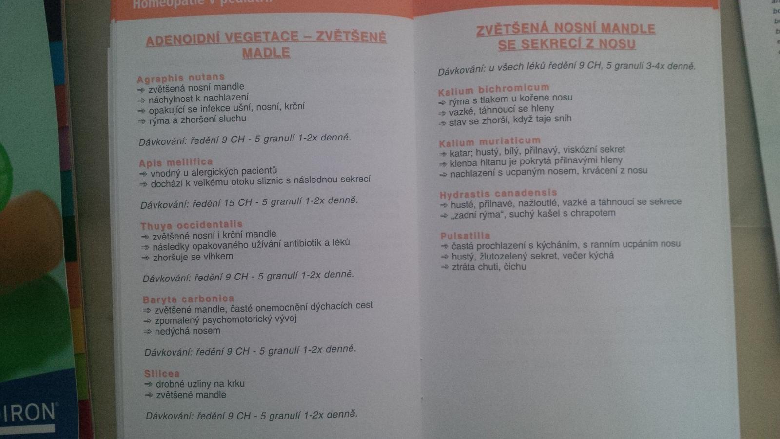 Nezajímala se jen o zvětšenou mandli,ale komplexně o syna,proč to tak je,proč se mu zvětšila...Ubrala jsem mléčné výrobky,mléko kravské nedávám,školku jsem pozastavila,syn bere Natrium nuriat.,Carcinosin,snad píší dobře,jde to po ní špatně přečíst,ale je více homeopatika na zvětšenou nosní mandli,spíše doporučují osobní návštěvu