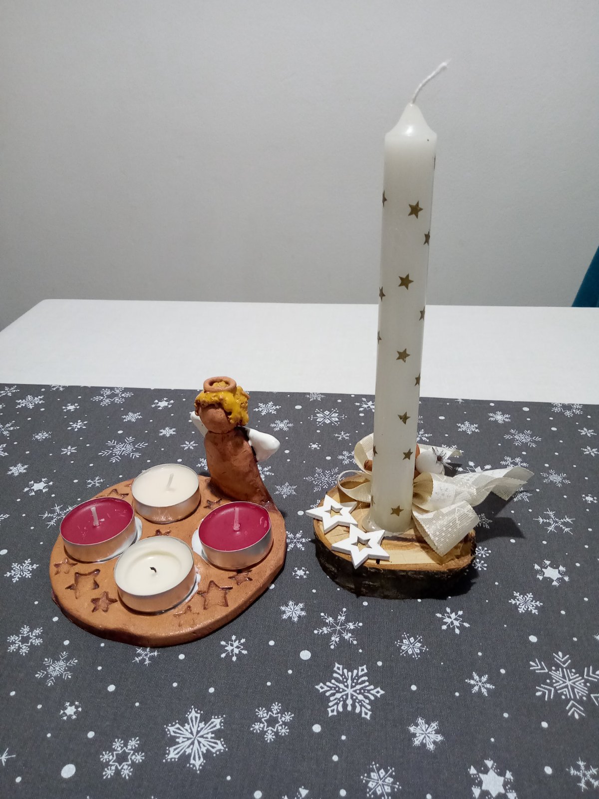 Máme jednoduchý adventní věnec i svícen, který tvořila dcera 😊