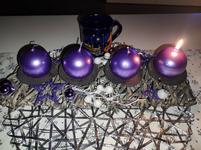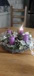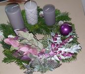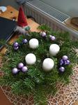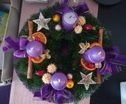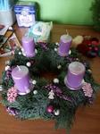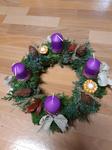 Adventní věnec máme vždy. Letos máme ponechaný ten z loňska (šiškový, fialový), vyrobený z centra pro zdravotně postižené.