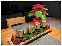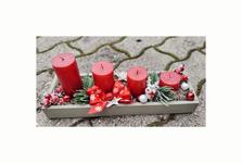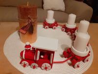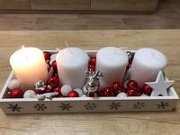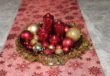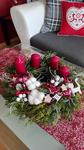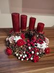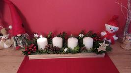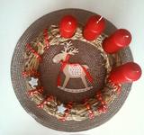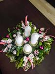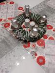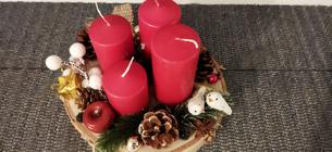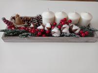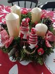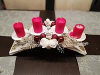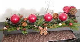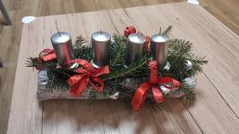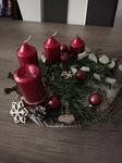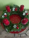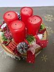 Svícen máme se 4 svíčkami na dřevěném kruhu a s přírodní klasikou 🙂 dominuje barva zelená a červená. 🙂