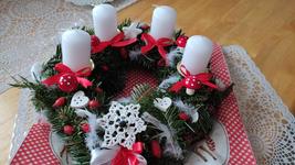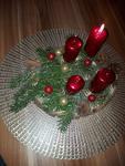 Adventní věnec nemáme. na poslední adventní neděli si udělám malou výzdobu na stůl - 4 svíčky, chvojí, banka, mašlička, letos bude podklad červený tác.
