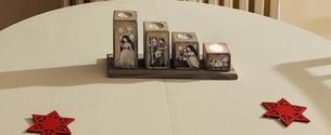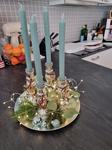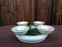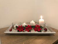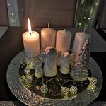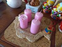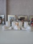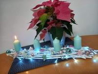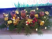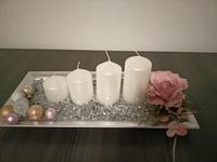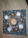 Těžko říct, jak ho nazvat, je velmi minimalistický. Na bílém čtvercovém kameninovém tácu jsou plastelínou přilepené čtyři skleněné kalíšky na čajové svíčky a do nich podle nálady vkládáme různě barevné a voňavé čajové svíčky. Nějak nebyl čas chystat něco většího, ale první svíčku jsme si v neděli zapálili, dokonce nám holky zazpívaly koledy, když jim zrušili zpívání u stromečku.