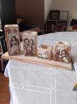 Jsou tam 2 dřevěné srnky a okolo skleniček na svíčky jsou hvězdičky. Podlouhlý tác je ze dřeva.