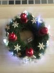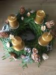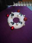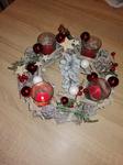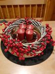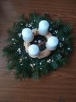Máme kupovaný bílý dřevěný věnec ozdobený větvičkamis červenými zasněženými kuličkami a zlatými lístky, kam každý rok dokoupím jen svíčky. Letos jsem přikoupila zelené větvičky, abych ho trochu obměnila.